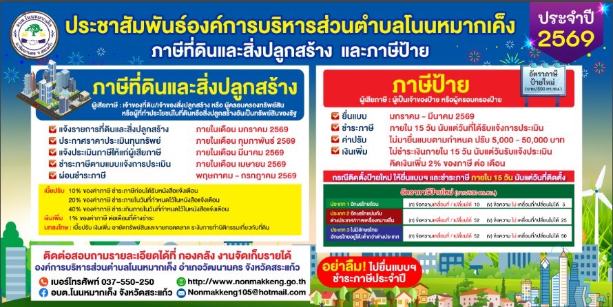 ประชาสัมพันธ์องค์การบริหารส่วนตำบลโนนหมากเค็ง ภาษีที่ดินและสิ่งปลูกสร้าง ภาษีป้าย ประจำปี 2569 |